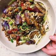 Paleo Chinese eggplant in garlic sauce with minced meat and soft buttery eggplants. Healthy, low carb, gluten-free, and Whole30 Chinese eggplant recipe.