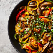 This spicy eggplant stir fry is so easy to make and is a delicious vegan dinner! The sweet and spicy sauce and fresh veggies makes this recipe a winner.
