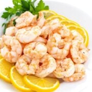 Shrimp is tossed with olive oil, lemon and garlic then roasted in a sheet pan until firm and bright pink. This 15 minute dinner recipe is going to be a new go-to!