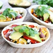 This sweet and spicy salad features grilled corn, bell peppers and red onions, arugula, feta, black beans and avocado! It can be a main dish or side salad.