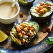 Grilled avocado is stuffed with a fresh mixture of cucumber, tomato and crispy grilled chickpeas! A drizzle of tahini makes this a delicious, vegan dinner!
