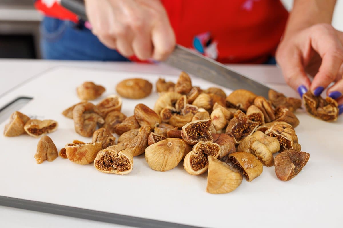Step 1. Start by cutting up your dried figs and making sure youโve removed the hard stems.