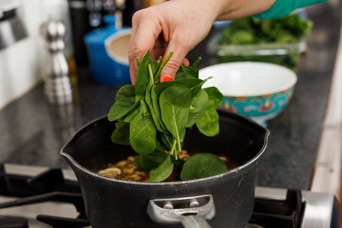 - Add frozen dumplings, mushrooms, and baby spinach to the boiling broth and simmer for 3 minutes until dumplings are warmed through and kale is wilted.
