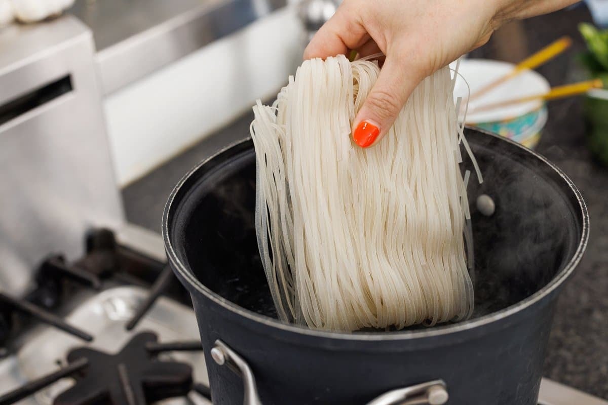 Start your wonton soup by bringing a pot of water to a boil and cooking your rice noodles according to package instructions. Once cooked, drain and set aside.