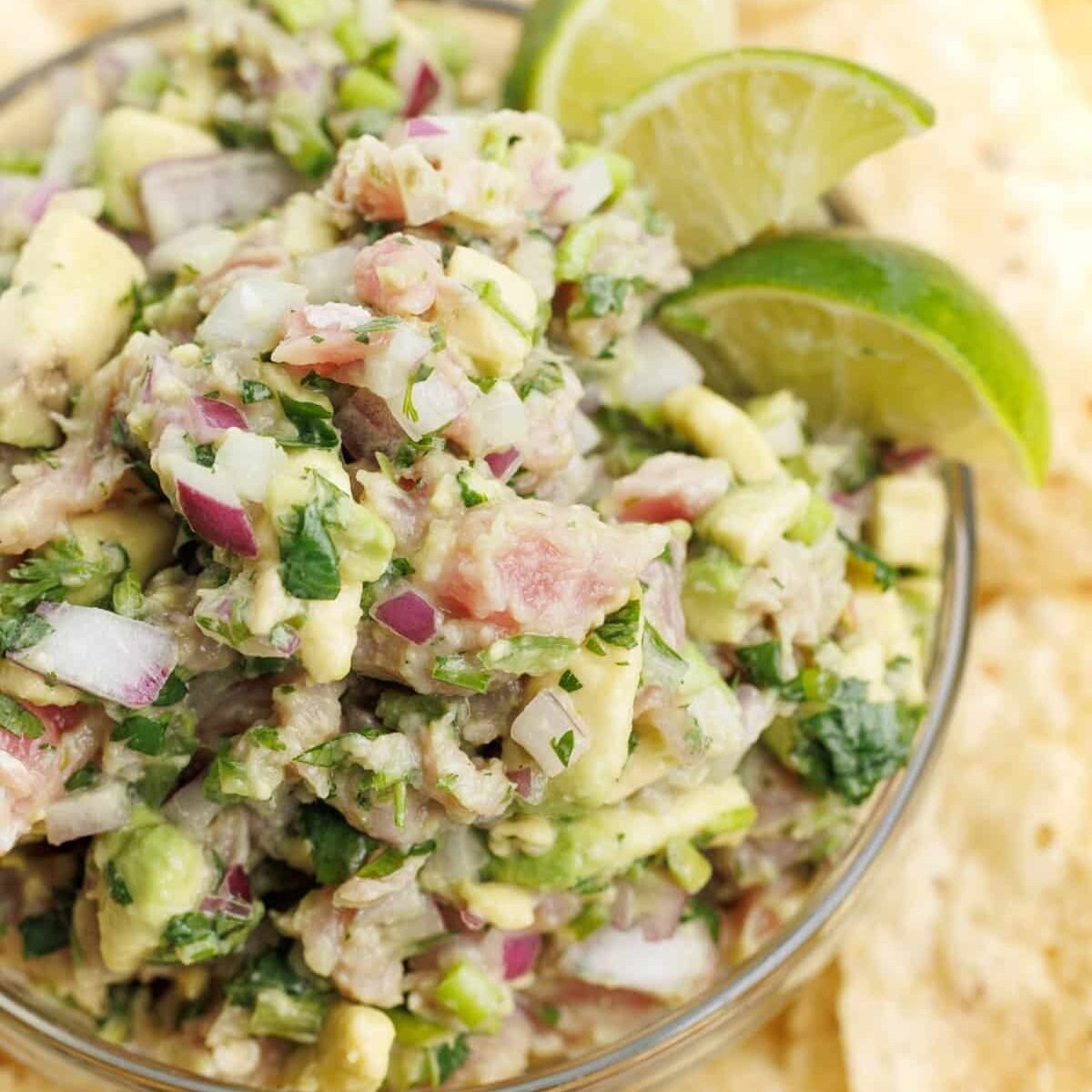 Let sit for about 20 minutes or so before serving for the lime juice to do it’s thing, and then enjoy your Ahi Tuna Ceviche alongside a plate of tortilla chips! Make sure to use corn tortilla chips if you want to keep the dish gluten-free.