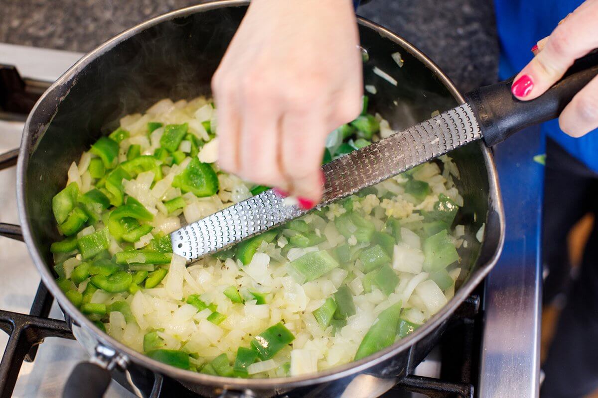 - While pasta is cooking, heat oil in a large, deep skillet. Add onion, peppers and garlic plus a pinch of salt and pepper and saute until tender, about 5-6 minutes.1 tablespoon extra virgin olive oil, 1 medium onion, 1 green bell pepper, 2 cloves garlic, salt and pepper