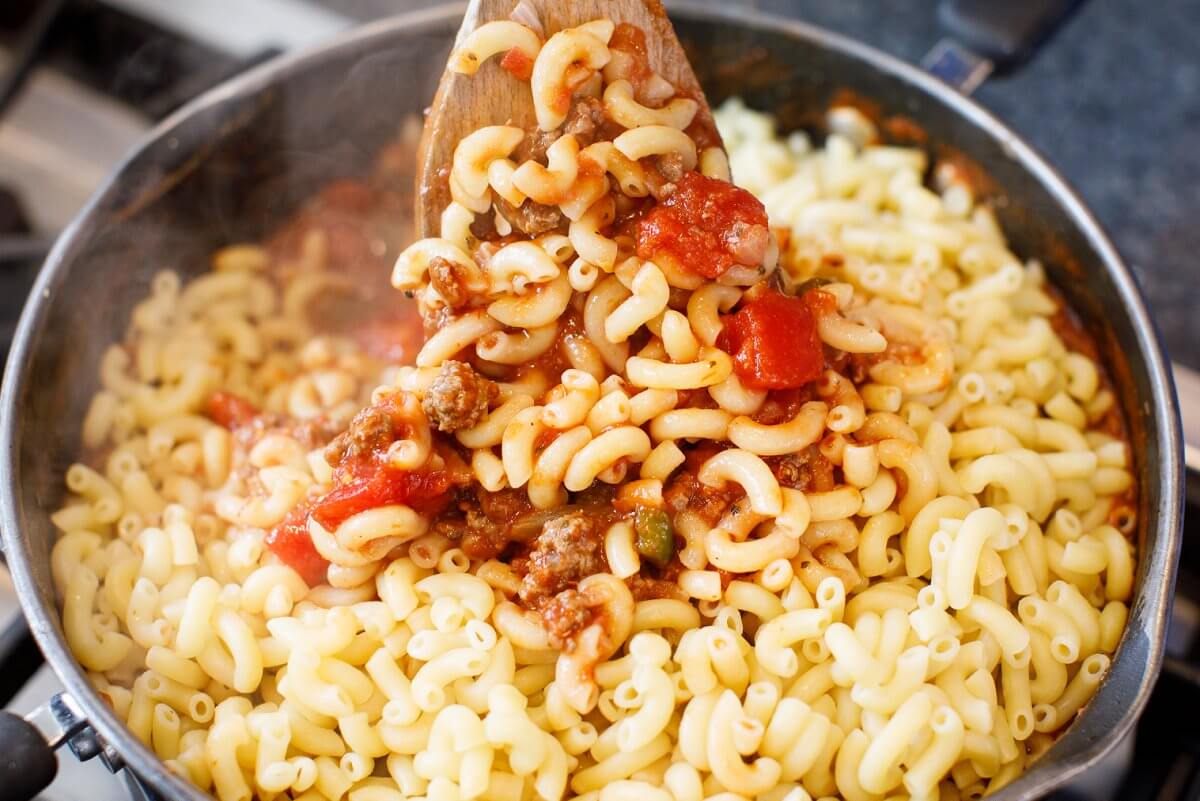 American goulash, is a simple macaroni pasta dish made with a hearty meat sauce. Family-friendly and crowd-pleasing, this dish is affordable and delicious!
