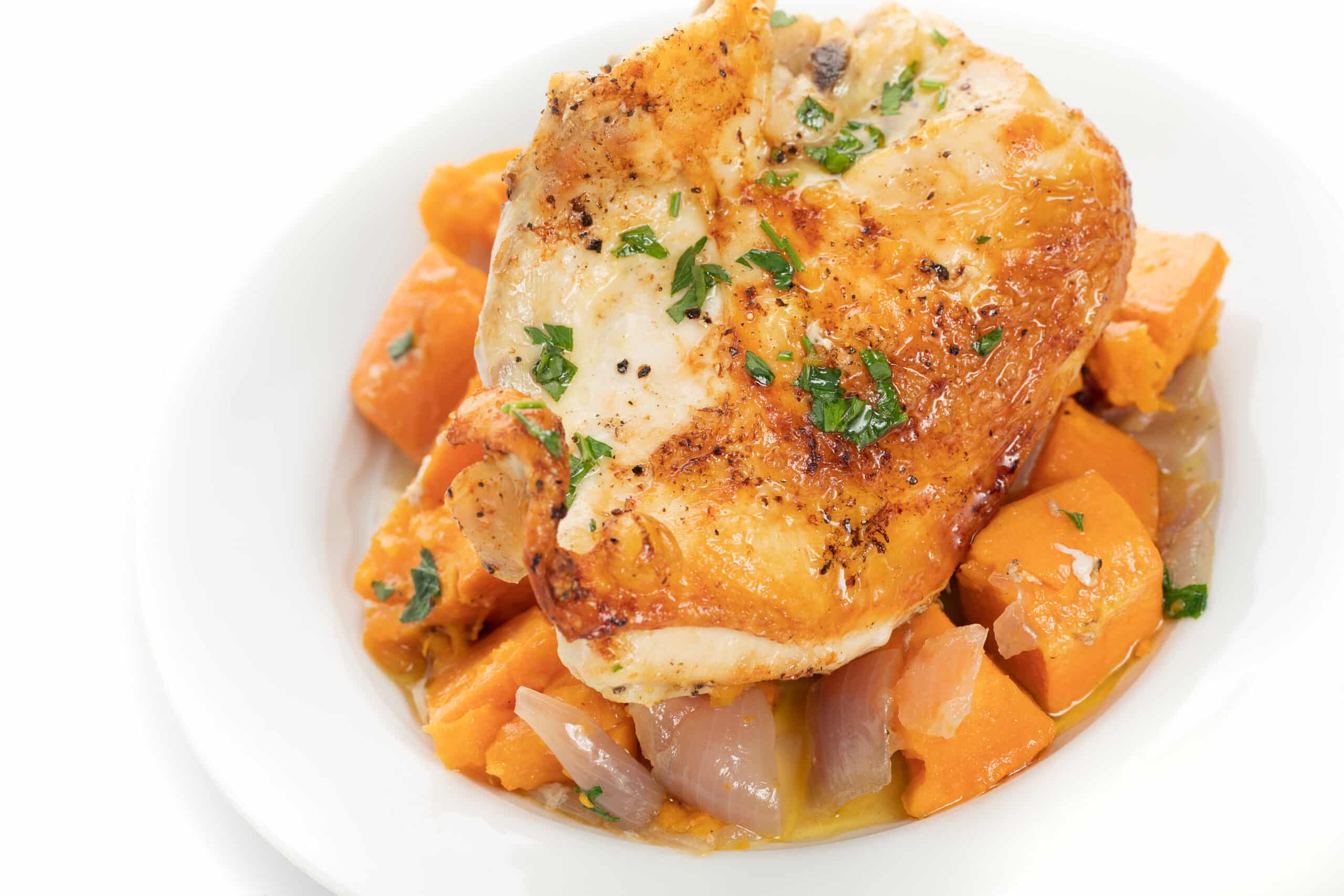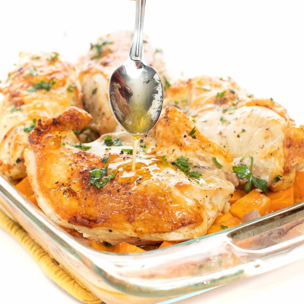 This easy baked chicken and sweet potatoes recipe is made with garlic, onions, and white wine. Simple, comforting, and delicious!