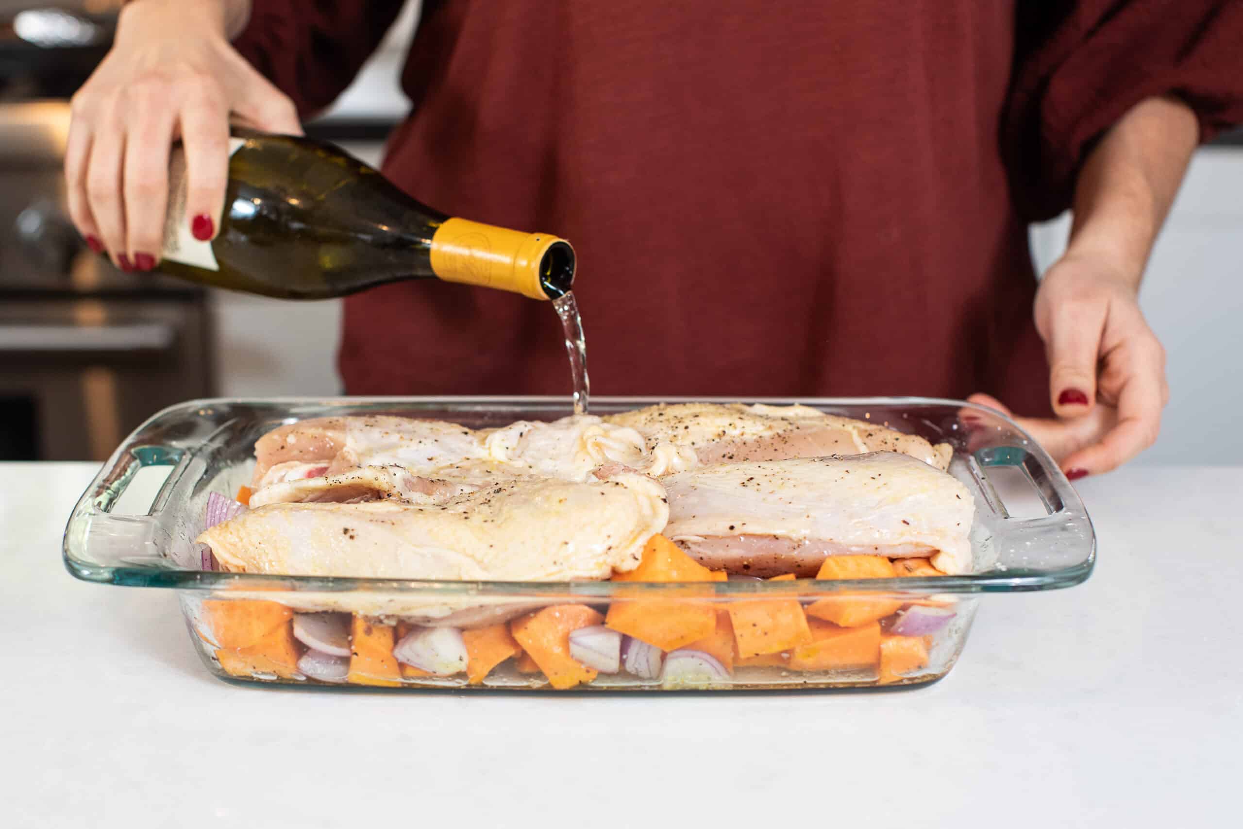 Season your chicken breasts with salt and pepper on both sides, then lay on top of the vegetables. Next pour in the white wine. Toss in the oven at 375 and roast until chicken reaches an internal temperature of 165, or about an hour.
