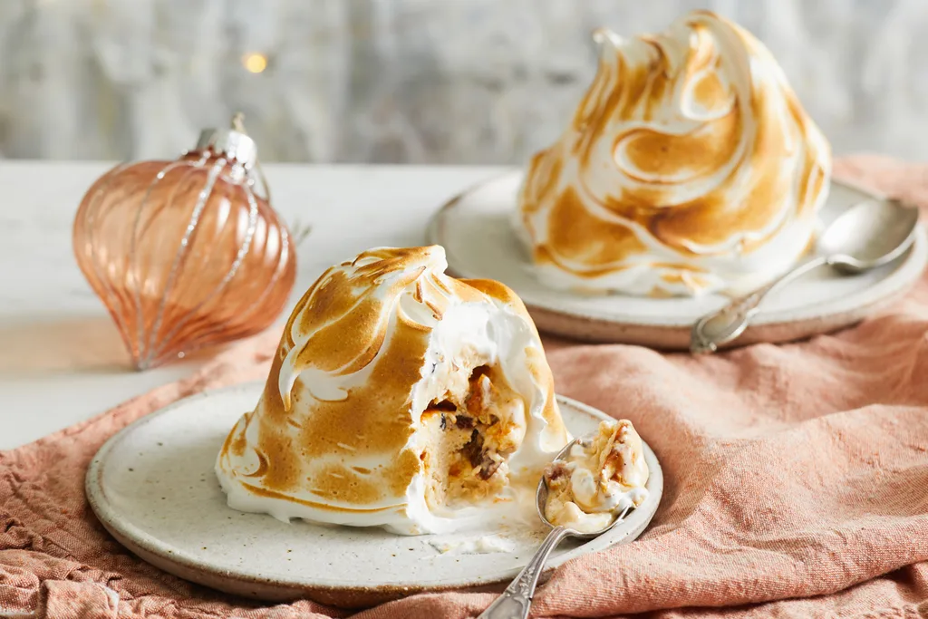 Despite their beautiful appearance, these meringue-topped spectacles are more than just looks. Packed with a sherry, almond and dried fruit-infused ice-cream filling, they will delight Christmas lunch guests with their festive flavours.