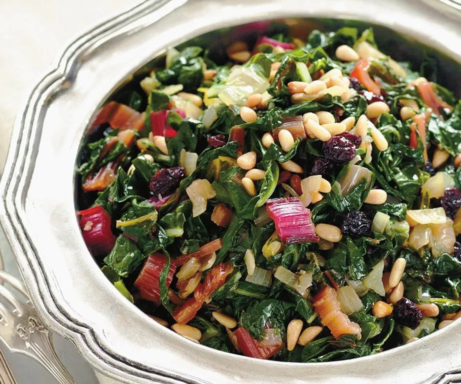 Rainbow silverbeet with pine nuts, garlic and raisins