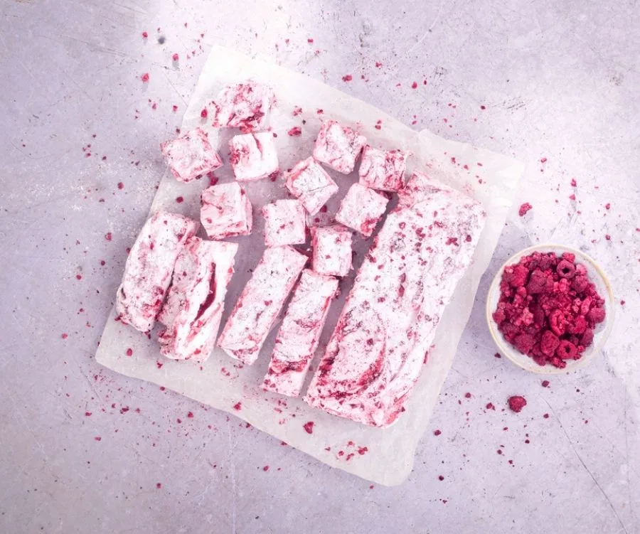 Juicy raspberries are the hero of these delicate marshmallow squares. The small morsels with a marbled raspberry coulis surface look almost too good to eat. Pretty in pink, they are also great for gifting. Simply pack a handful into small boxes and tie with pink ribbon for the ideal edible present.