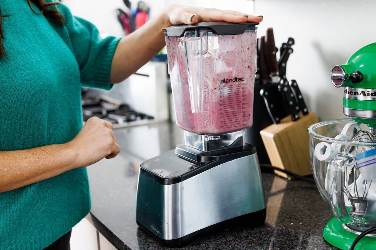 Start your banana raspberry chia smoothie by peeling your banana and adding it to your blender.