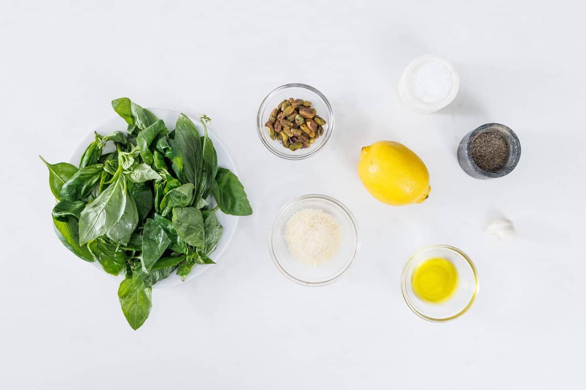 - Pistachios: A little bit sweeter than pine nuts, so the finished pesto has a sweet edge to it. The green tint of the nuts also adds to the bright green color.
