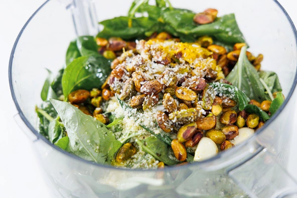 To make your basil pistachio pesto, add all of the ingredients (except olive oil) to a food processor and pulse a couple times to get it started. Making homemade pesto is super easy to do in a food processor. However, you can make it in a blender as well, or the old fashioned way by using a mortar and pestle.