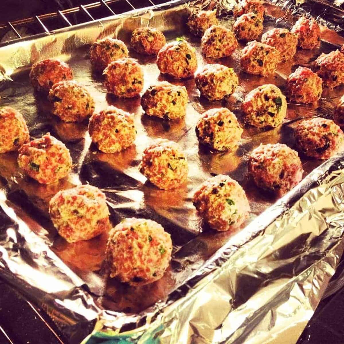 - Using a small cookie scoop or two spoons, scoop out the meat mixture and roll into balls and place in an even layer on the baking sheet.