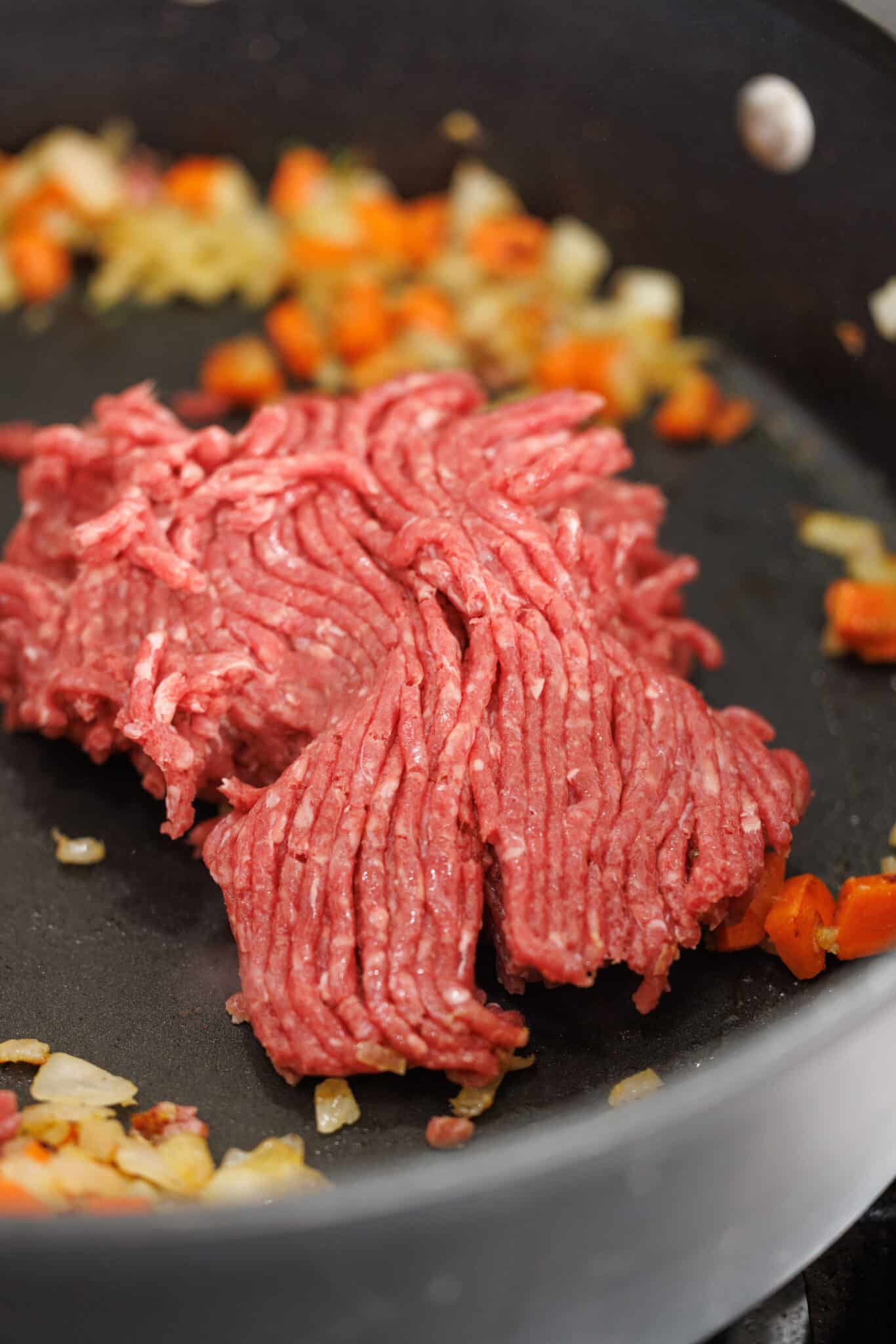 - Add sirloin to the pan along with a pinch of salt and pepper then begin breaking up with a wooden spoon. Sprinkle in the rosemary and oregano then continue cooking until beef is browned almost to the point of forming a crust.