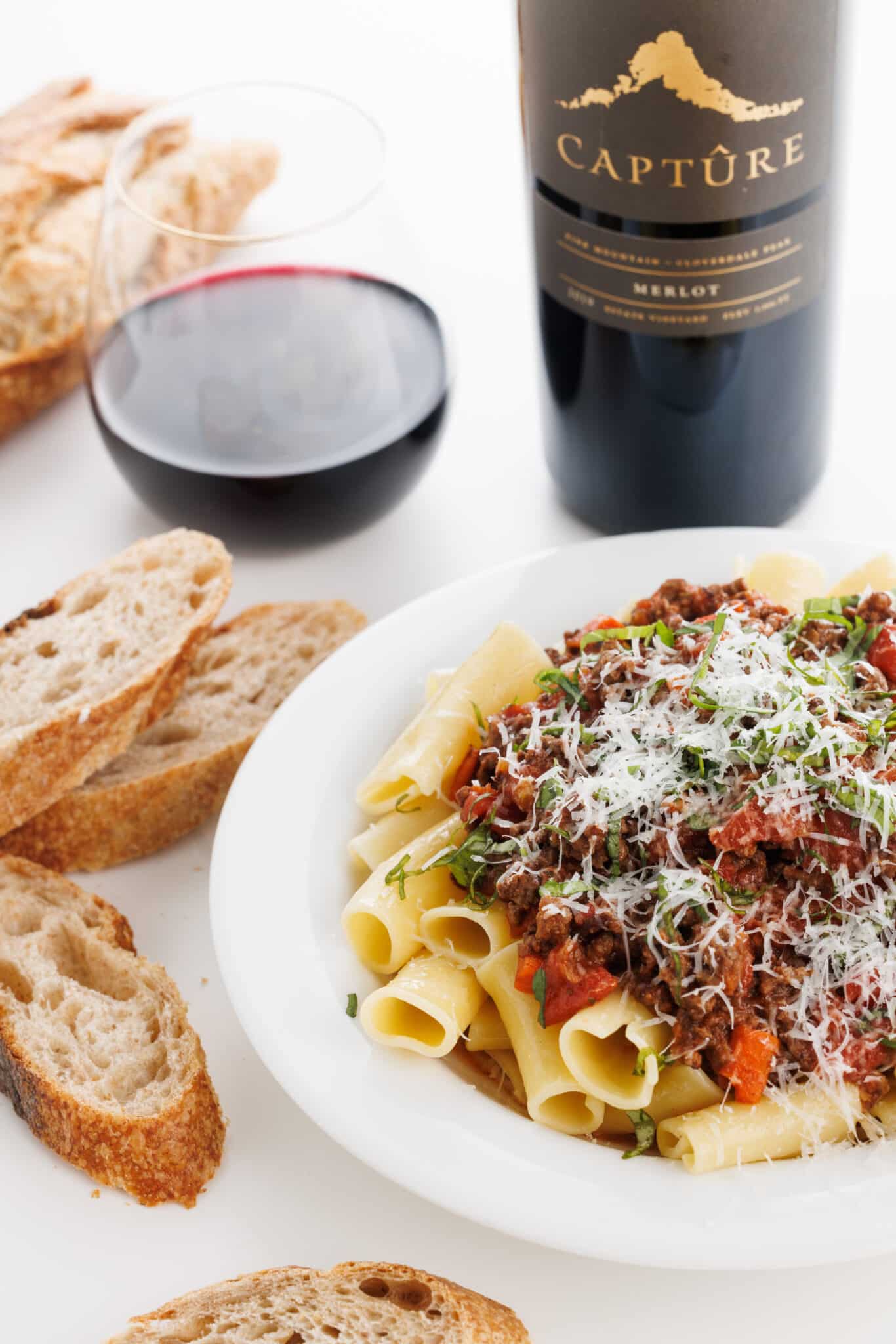 Cozy up with family and friends and enjoy this delicious Beef Bolognese. Be sure to pour yourself a glass of Captûre Merlot along with it.
