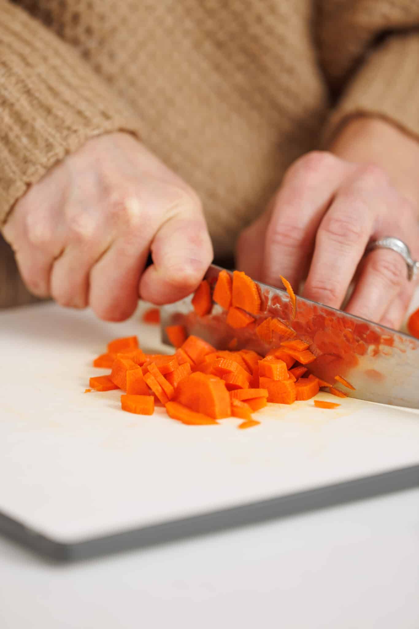- Heat a large, deep skillet over medium high heat and drizzle with olive oil. Stir in onions, garlic and carrots along with a pinch of salt and pepper. Sauté until veggies are tender, about 6-7 minutes.