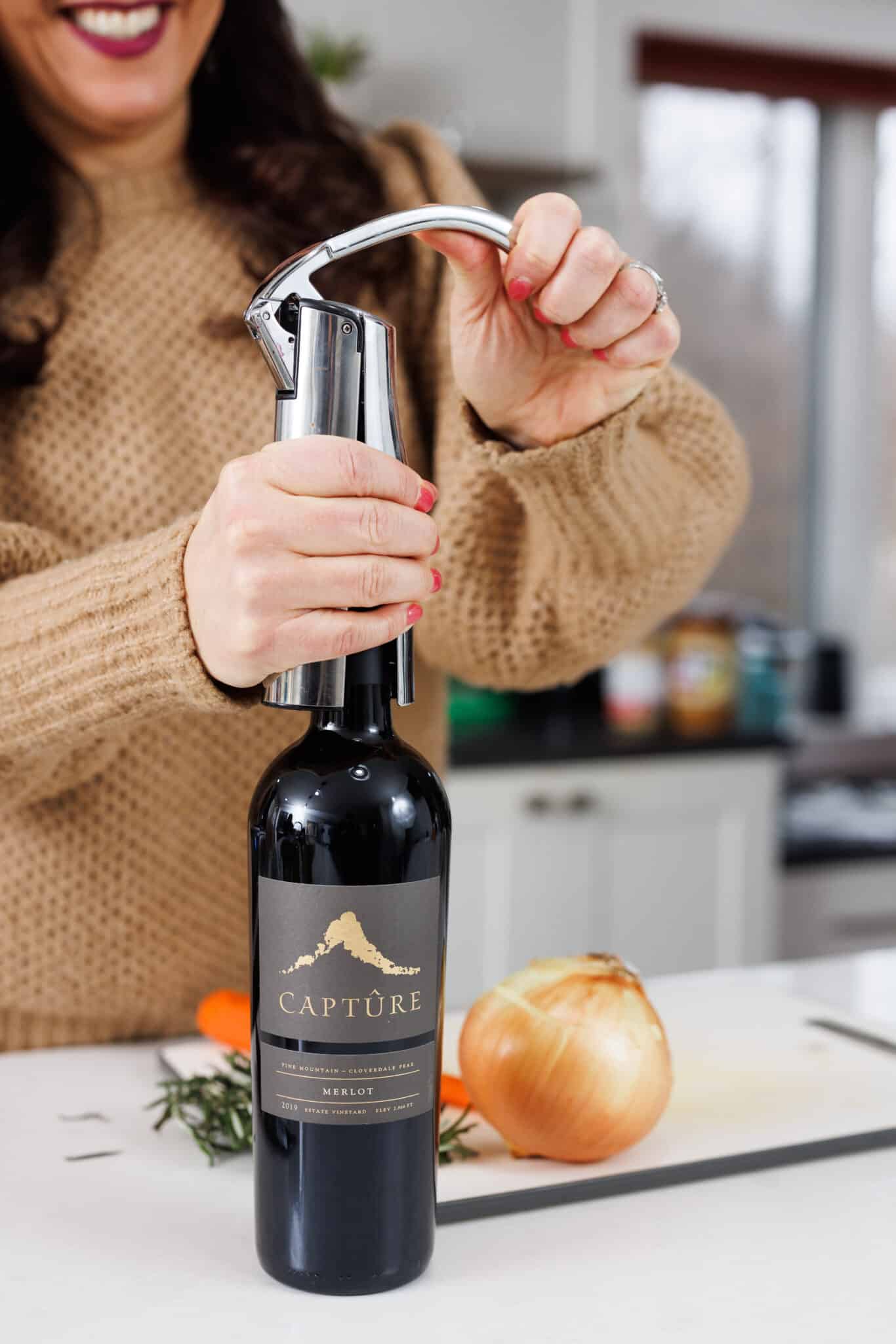 Then you’ll pop open your Captûre Merlot and use it to deglaze your pan, using a wooden spoon to scrape up any bits stuck to the bottom.