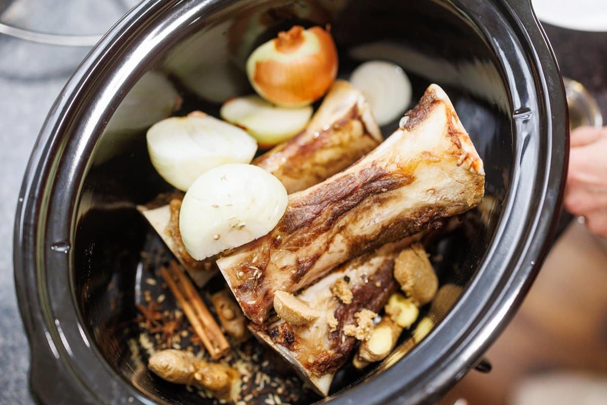 This rich and aromatic beef pho bone broth is made in a slow cooker with warm spices including cinnamon, cloves, and coriander.