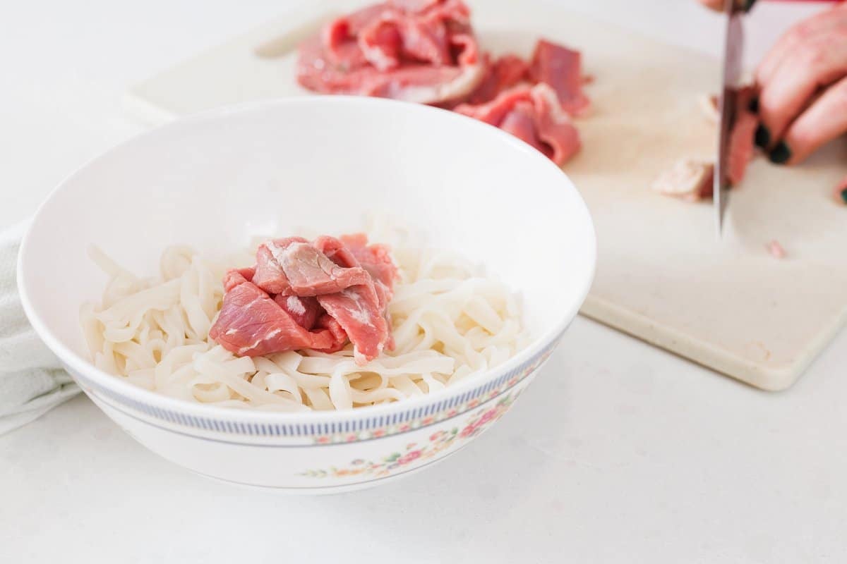 Then remove the bones, and strain the hot broth over the top of your noodles and beef.
