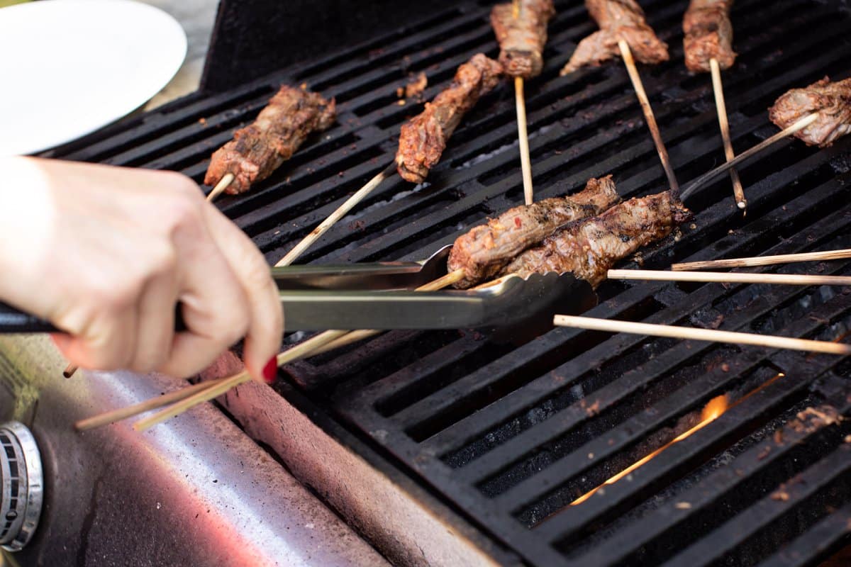Then grill your skewers over medium-high heat for 2-3 minutes a side. Then let beef rest for 10 minutes.