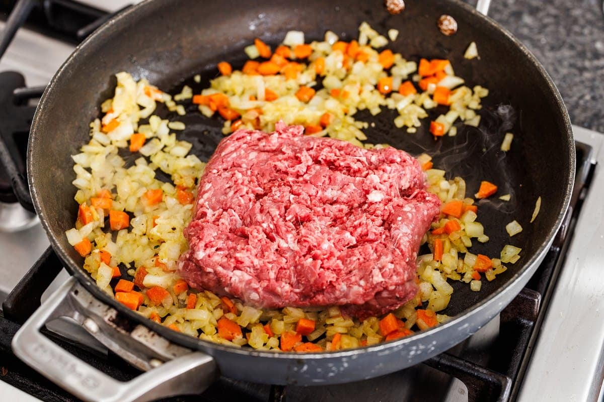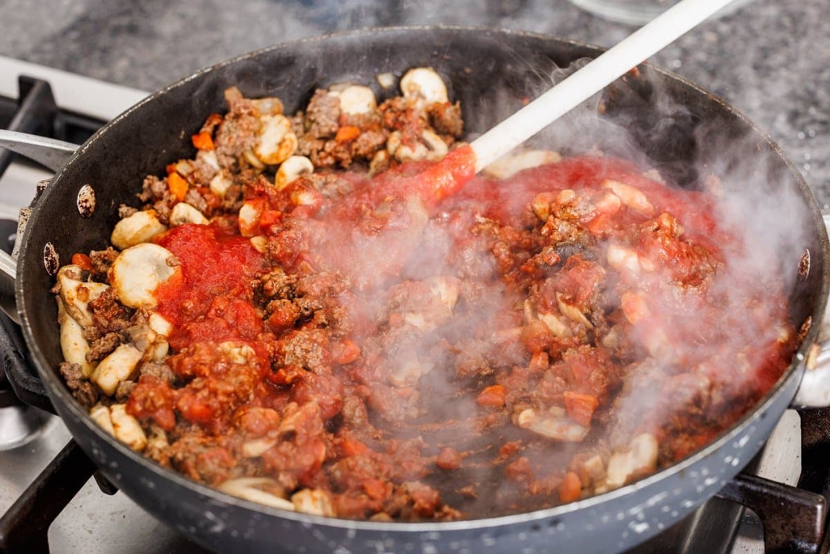 - Once mushrooms have lost most of their moisture and bison is nicely browned and starting to form a crust (after about 10 minutes), stir in the tomato paste. Use wooden spoon to help incorporate paste into the meat mixture.2 tablespoons tomato paste