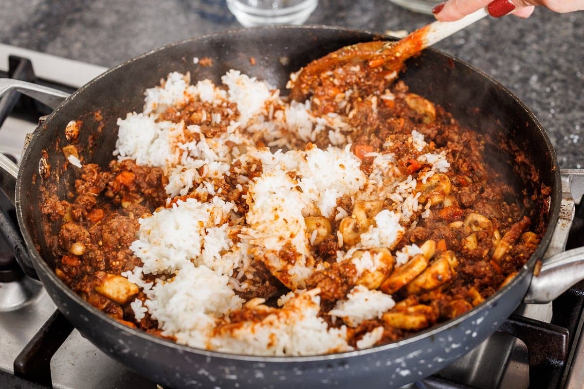 - Pour in the tomato sauce and cooked rice. Stir to combine and cook for an additional 2-3 minutes until mixture is warmed through. Check for seasoning and adjust accordingly before removing pan from the heat.14 ounce can tomato sauce, 1 cup cooked rice