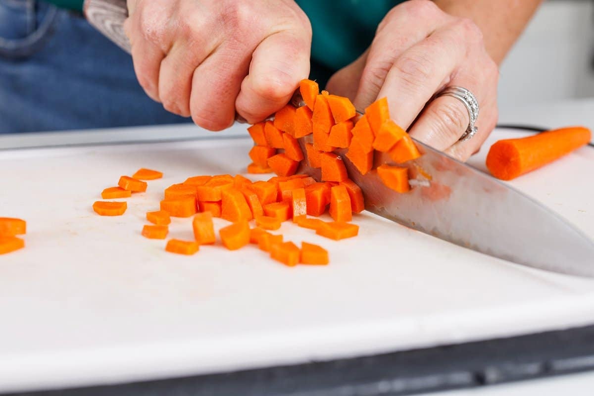 - Heat a large sauté pan over medium heat. Spray with cooking spray and add diced onion and carrot. Cook onion until softened, 3-4 minutes.1 medium onion, 1 carrot
