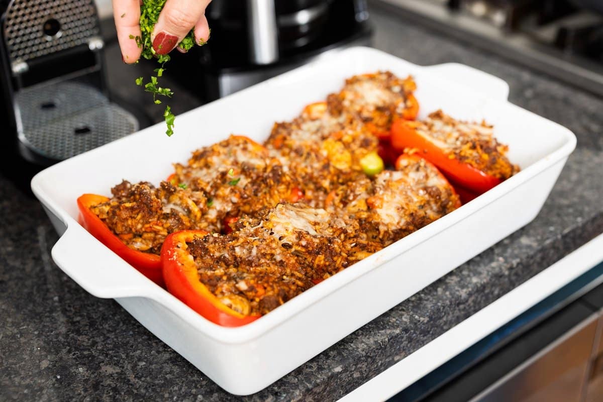 Once parmesan cheese has melted and peppers are softened, remove from the oven and garnish with fresh parsley.