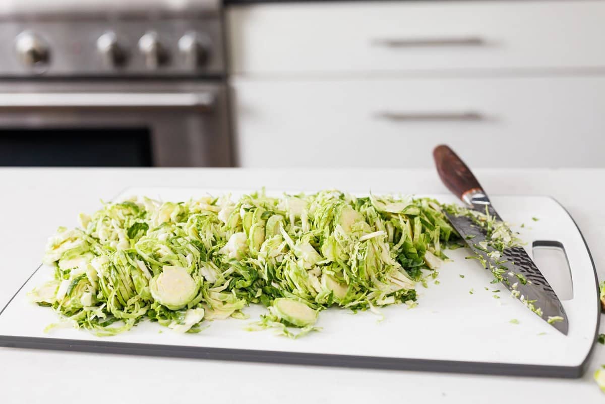 - Thinly slice/shred the Brussels sprouts using a food processor with the slicing blade Alternatively, slice them thinly with a sharp chef's knife. Place in a large bowl.