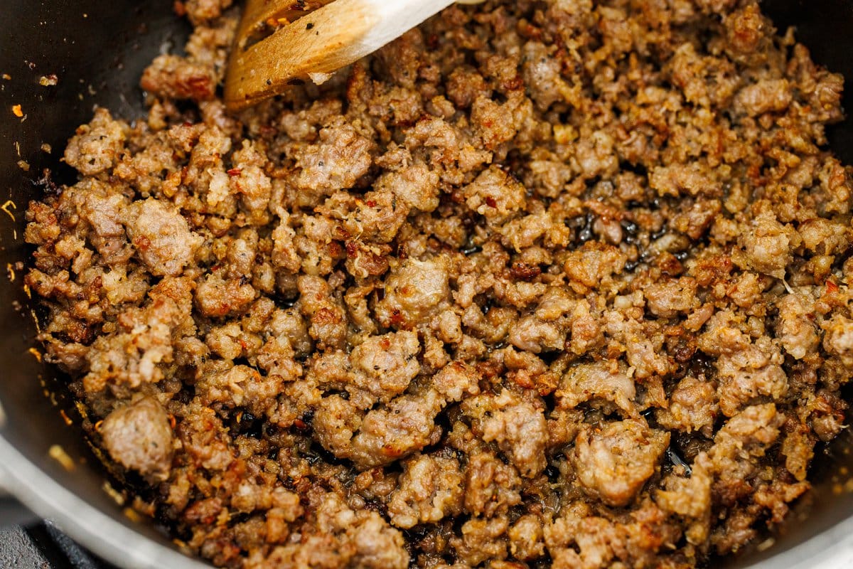 - Remove sausage from casings and add to pan. Use a large wooden spoon to break up the sausage and begin browning the meat.