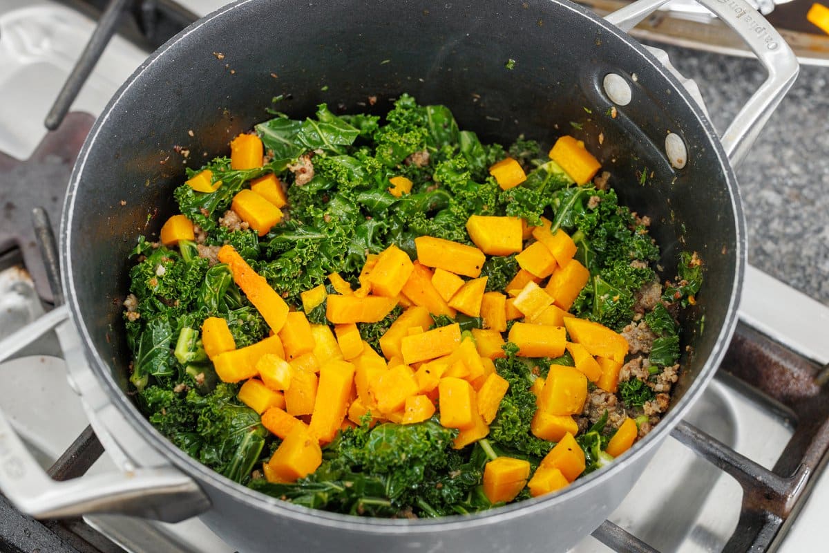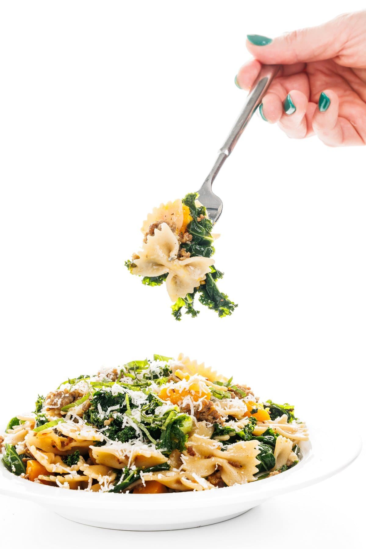 Butternut squash and sausage pasta is cooked with garlic and olive oil, while being tossed with wilted kale and nutty parmesan cheese.