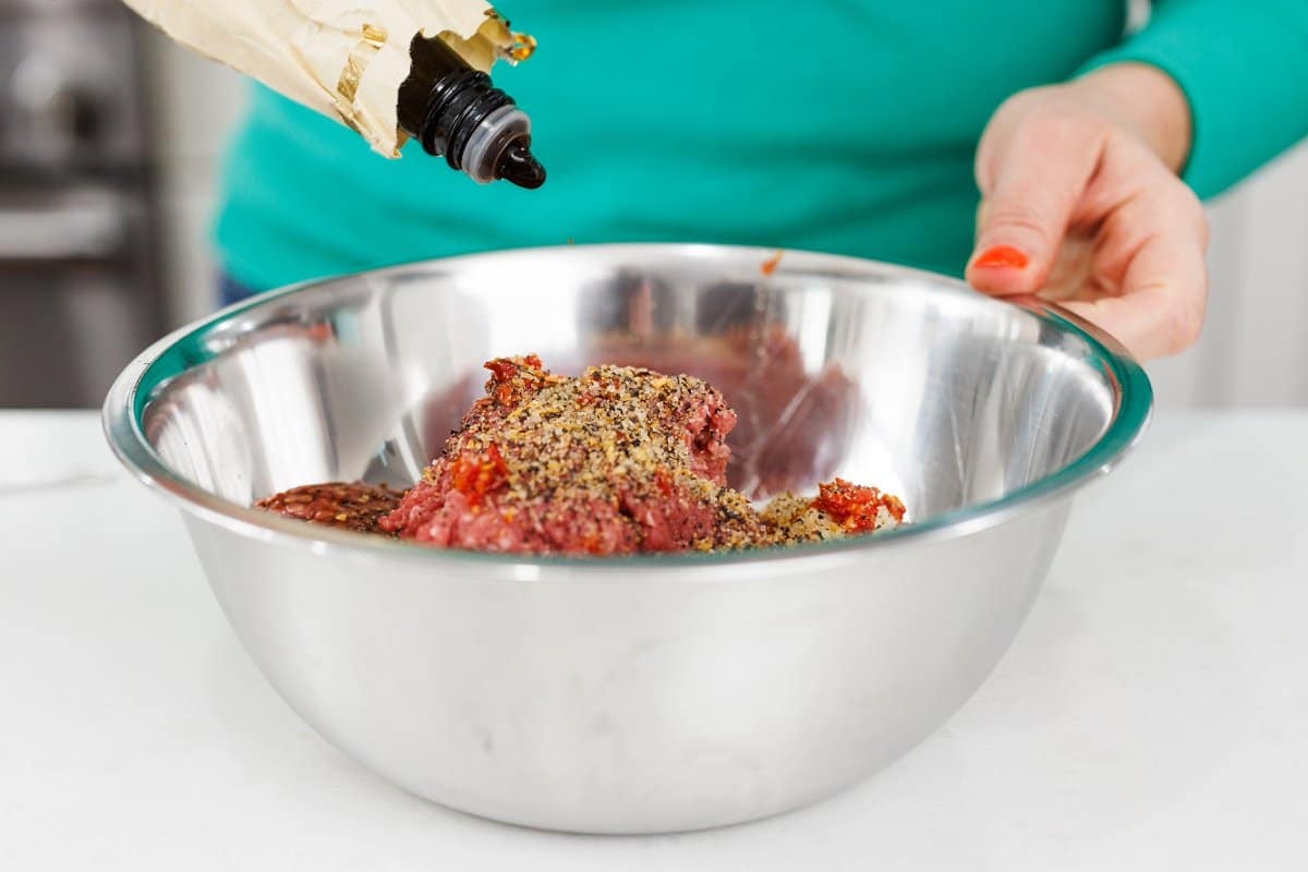 Then drizzle in the Worcestershire sauce.