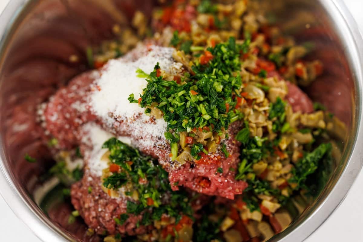 - In a large bowl, mix together first 8 ingredients (beef through parsley) with your hands until evenly incorporated. Divide mixture evenly between 12 muffin tins, gently shaping into small meat loaves.24 ounces ground beef sirloin, 1 clove garlic, 3 pieces sun-dried tomatoes, 1 teaspoon all-purpose grill seasoning, 2 tablespoons grated Parmesan cheese, 1/4 cup green olives, 2 tablespoons Worcestershire sauce, 2 tablespoons parsley