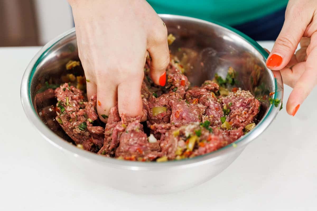 Once the ingredients are all evenly incorporated, fill a prepared muffin tin with the meat mixture.