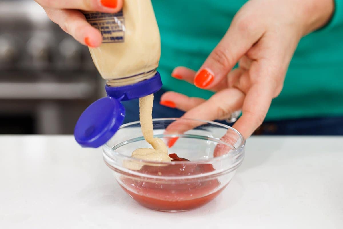 Then in a small bowl, mix together the ketchup and Dijon mustard.