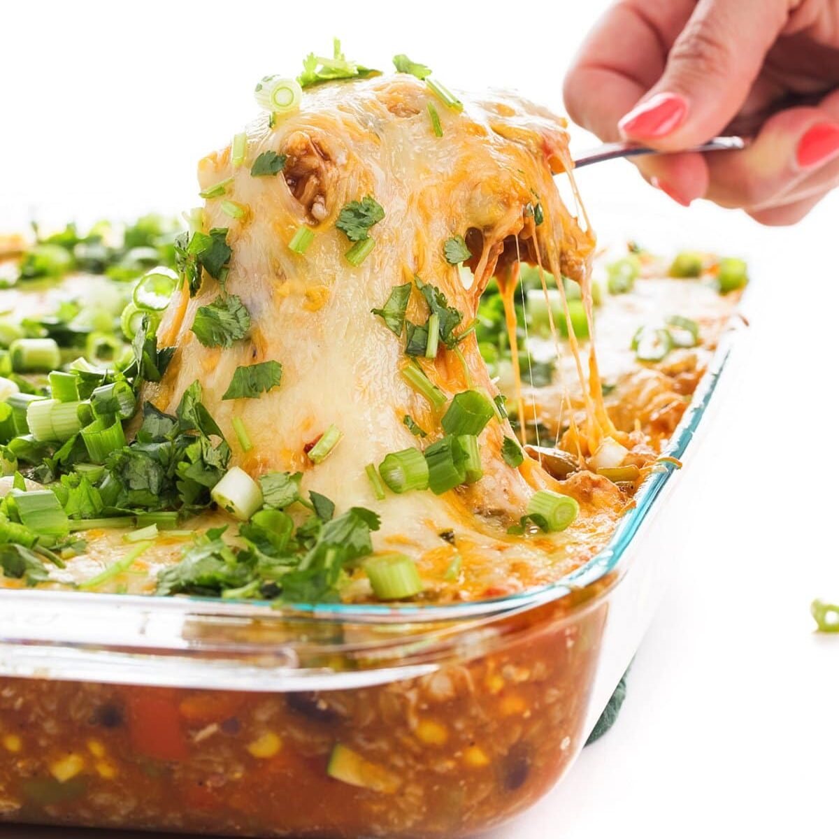 After baking, toss some green onions and cilantro on top before serving. This dish keeps well in the fridge and freezer so make a few extra servings for leftovers.