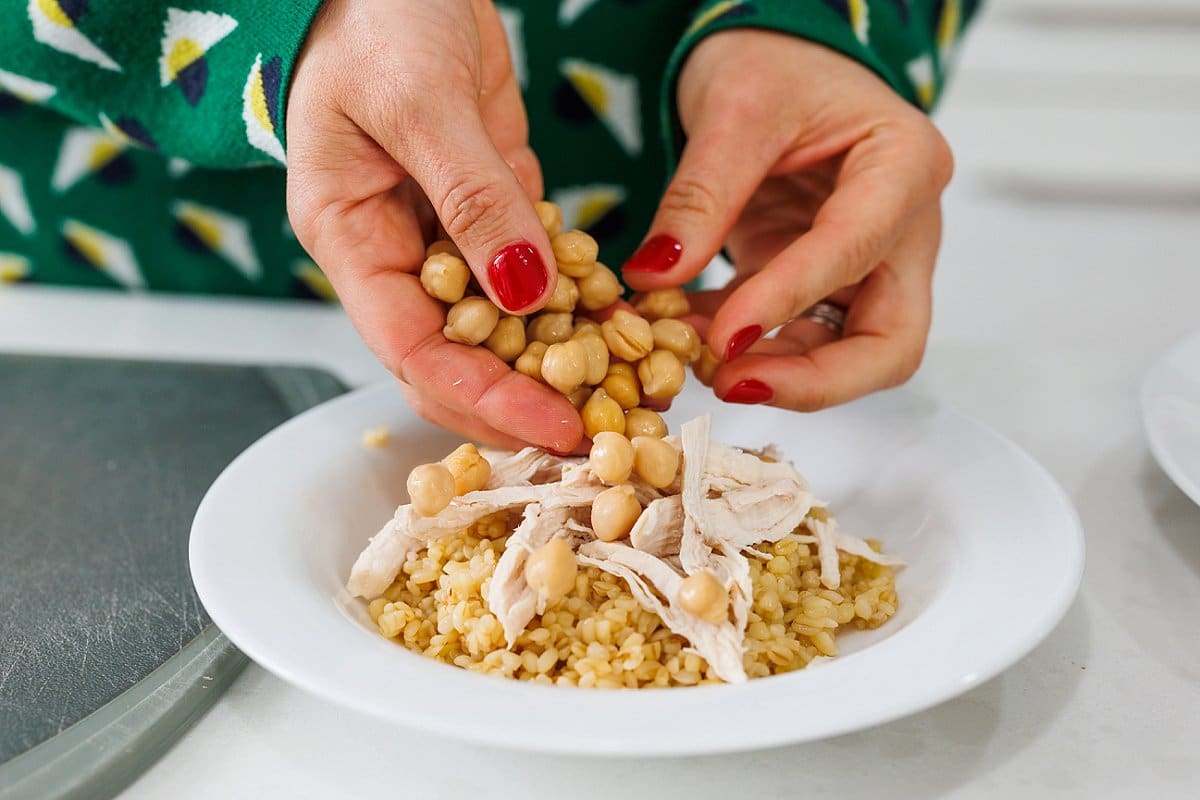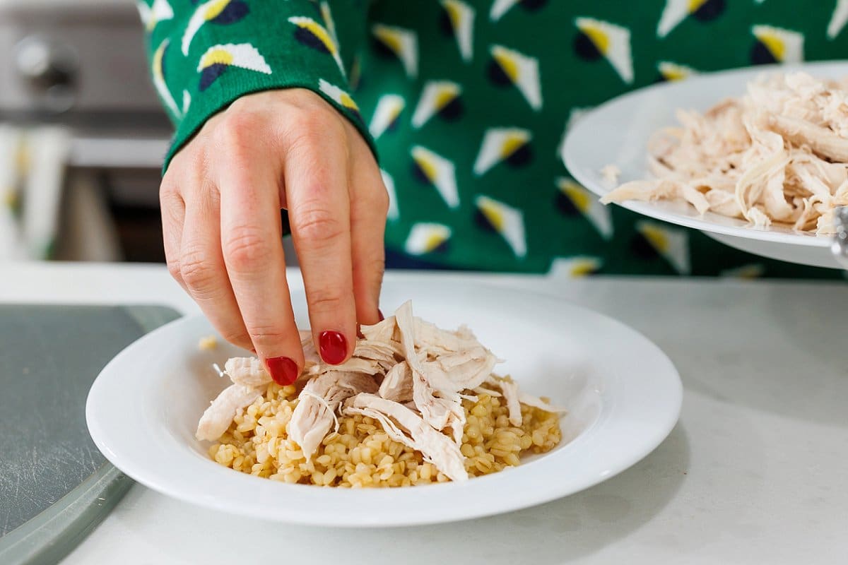 Add your lemon juice. Alternatively, you can warm the shredded chicken, chickpeas, and lemon juice all together in the bone broth and scoop all at once over the bulgur wheat.