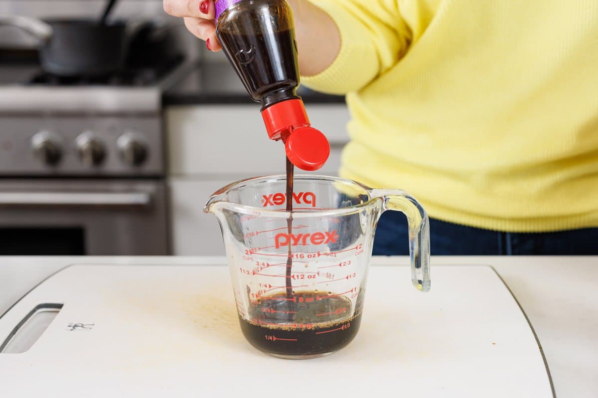 While chicken is cooking, make your stir-fry sauce. Start by adding the soy sauce into a bowl or measuring cup.