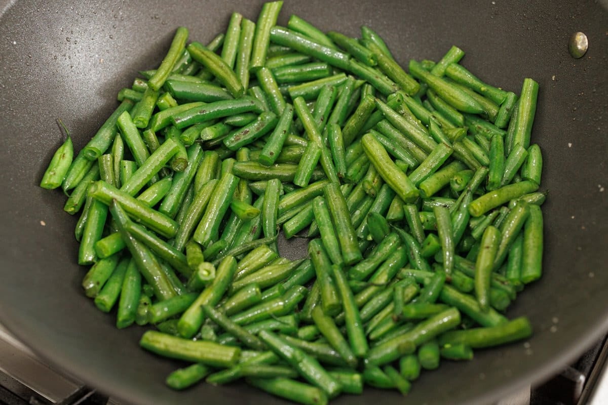 - Add green beans to the pan and toss until they start to soften, about 2-3 minutes.