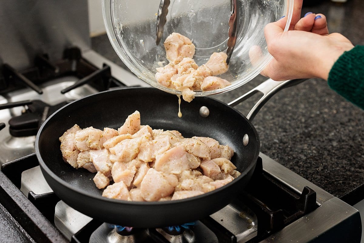 - To cook the chicken, place a large skillet over medium-high heat. Once warmed, add the chicken. Saute chicken until golden brown, stirring frequently, about 9-12 minutes.