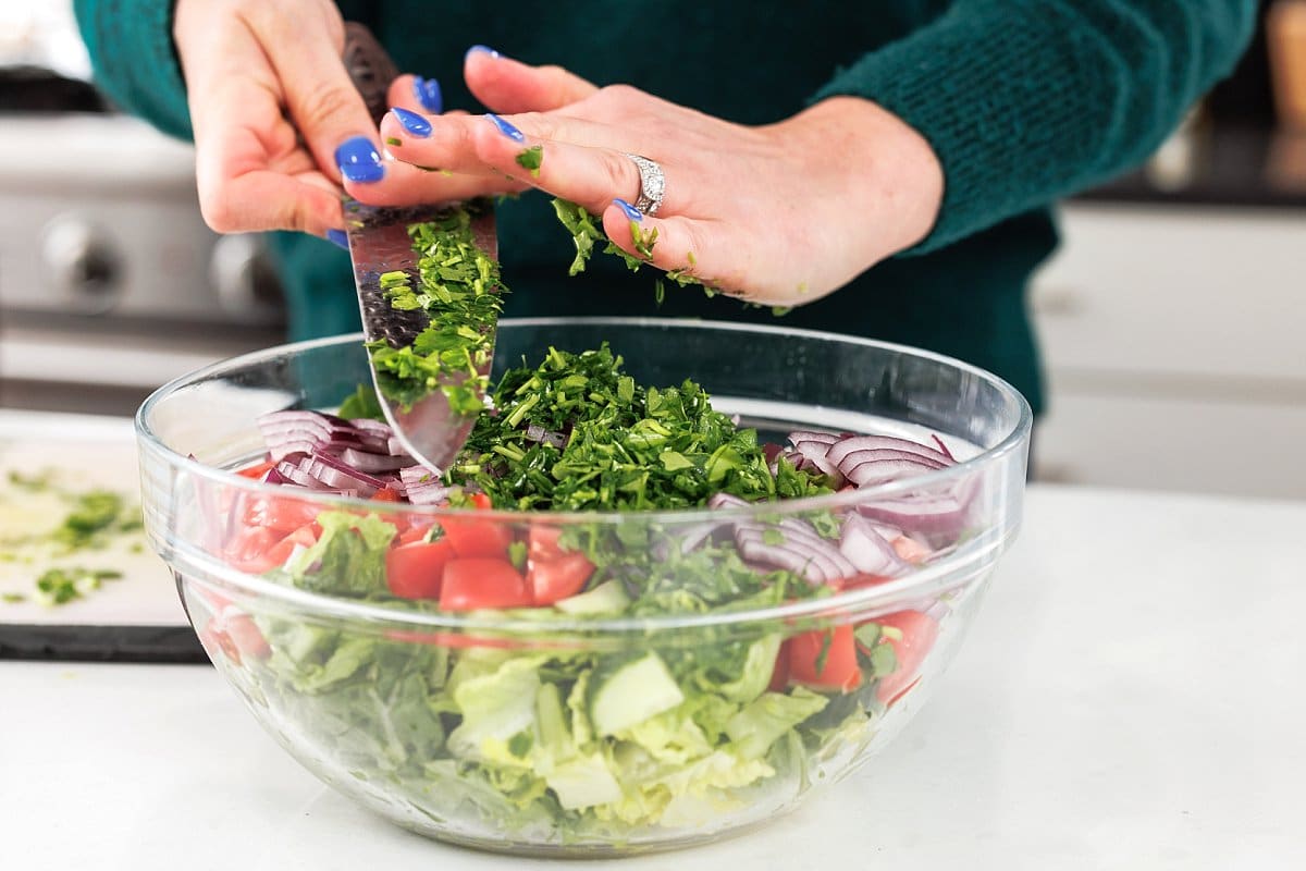Next, prepare your salad by chopping the lettuce, parsley, tomato, cucumber, and onion.