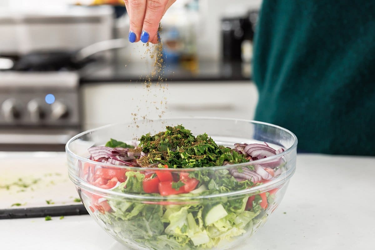 Top salad with za’atar, sumac, dried mint, olive oil, lemon juice, garlic, and some salt and pepper to taste.