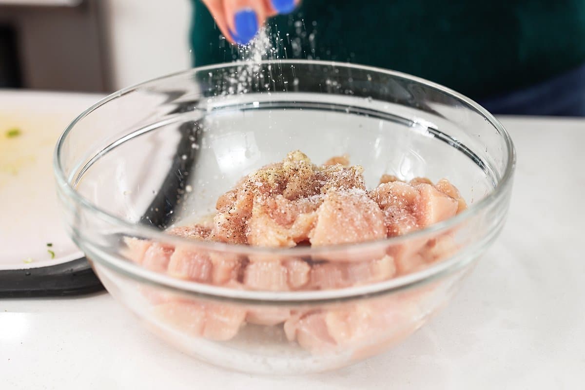 And season with salt and pepper. Let chicken marinate for at least 20 minutes.