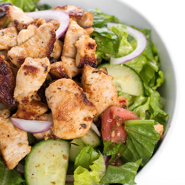 This satisfying chicken salad is made with tender breast meat marinated in a lemon, garlic vinaigrette then served over a fragrant Lebanese salad.