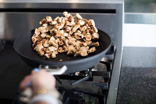 - Heat pan over medium-high heat. Add chicken to the pan along with all of the marinade. Sauté chicken, stirring frequently, until lightly browned, about 5-7 minutes. Alternatively, you can prepare the chicken in the oven.