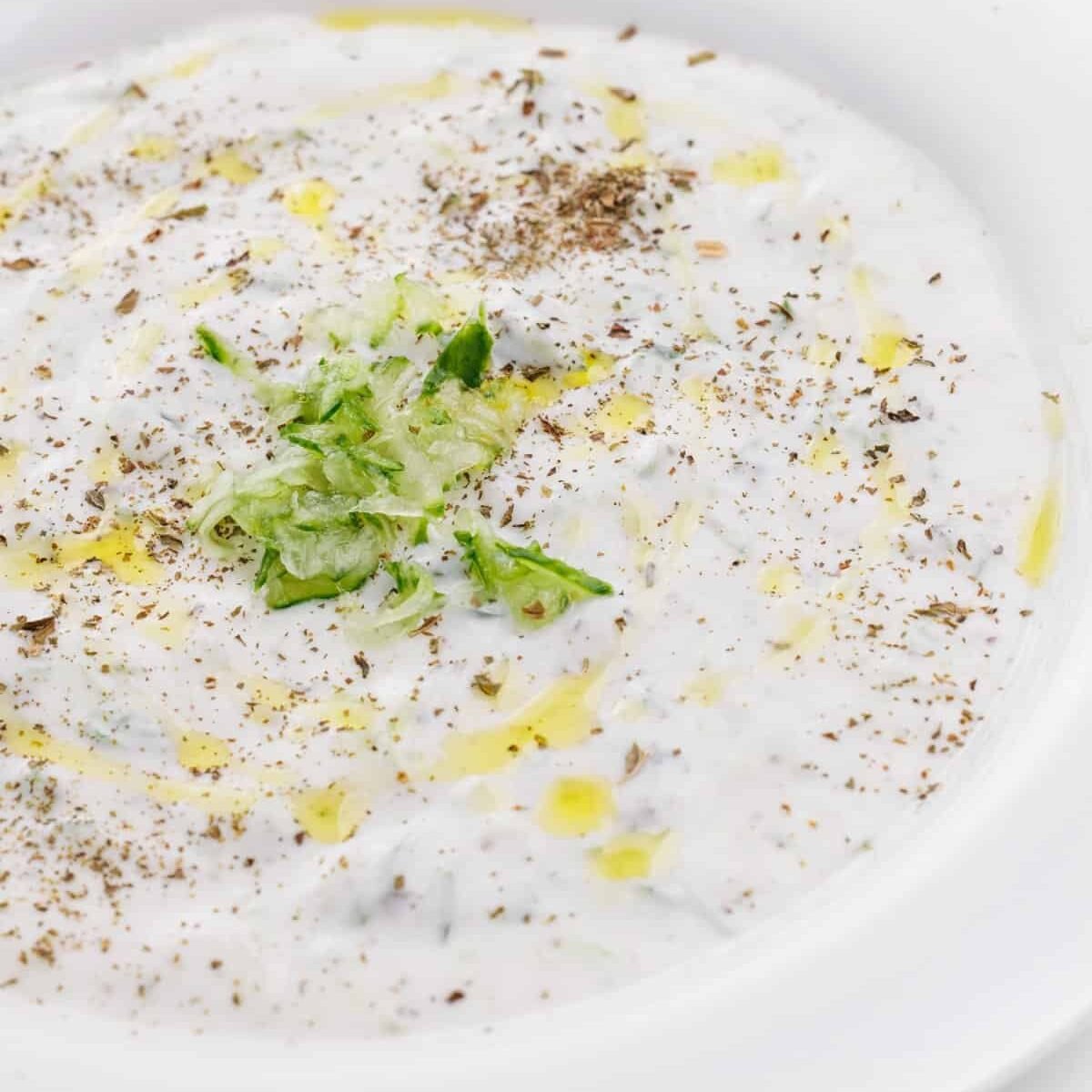 - In a large bowl, whisk together yogurt with grated cucumber, lemon juice, dried mint, grated garlic and salt.