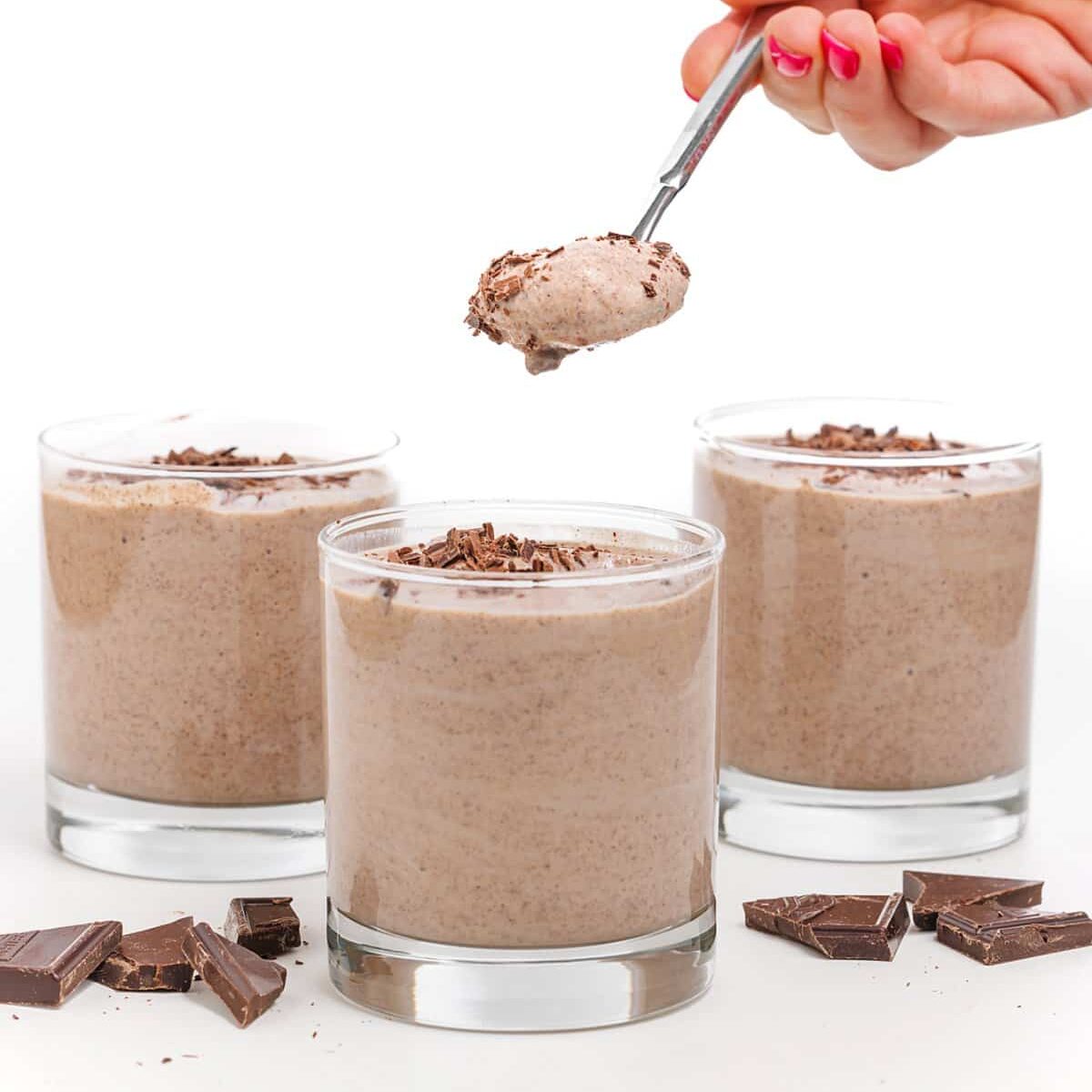 - Divide chocolate mousse between two glasses or serving bowls and refrigerate until chilled – 2 hours or overnight. Garnish with chocolate shavings.